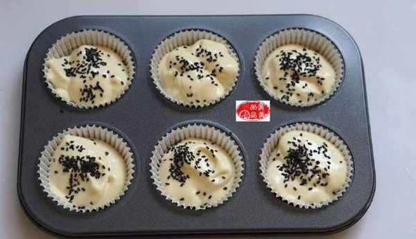 7、烤盤放入紙托,將蛋糊放在紙托裡,上面放一下熟的芝麻點綴一下。