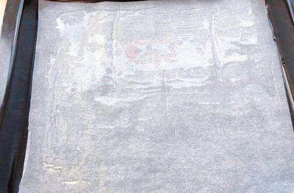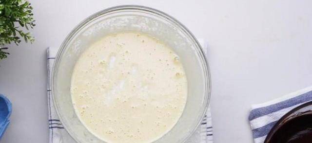 2.在烤盤底部先刷一層植物油,然後將油紙鋪在烤盤上,再刷一層油。將三分之一的面糊倒入鋪有油紙的烤盤中,向各個方向傾斜烤盤,使面糊流動,並在整個烤盤中鋪成薄薄的一層。