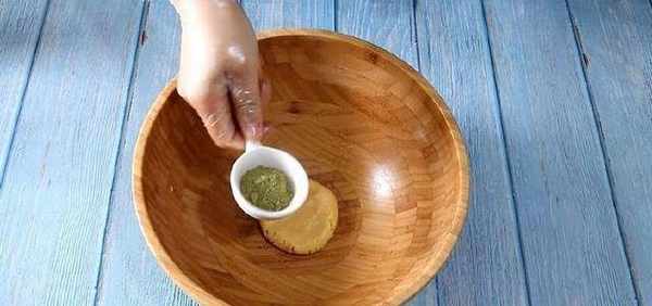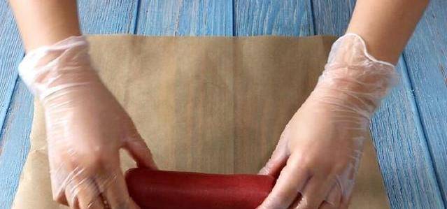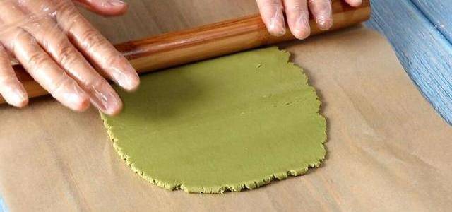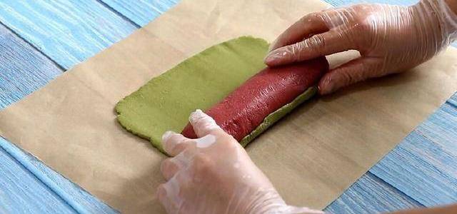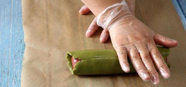 再將綠色面團搟成一個長方形,放入剛才搓好的紅色長條,用綠色面皮將紅色圓柱體面團包住。(綠色面皮不用搟太大,夠包得下紅色面皮就可以瞭。)