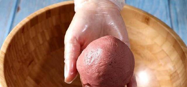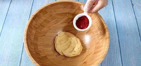 揉好的面團分成3:1,在大面團中加入紅曲米粉,揉勻。在小的面團中加入抹茶粉,同樣揉勻。