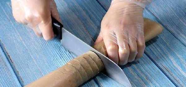 將面團放置冰箱冷凍櫃裡凍半小時,等凍結實一點200後,連同油紙一起切成片狀。