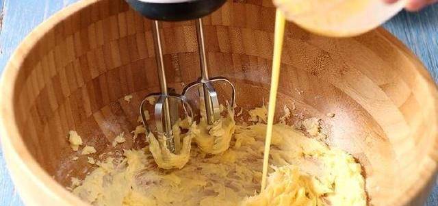 先用打蛋器把黃油和糖粉打勻,打至黃油微微發白,這時候將蛋液分多次加入到黃油裡面,每加一次蛋液,需要將之前加的黃油和蛋液攪拌均勻,融為一體。
