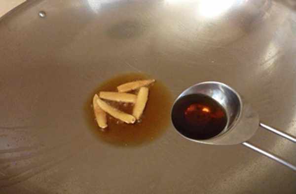 2.鍋燒熱,開小火下麻油與薑片爆香,炒至薑片邊緣微焦有香味即可(麻油不耐高溫,勿開大火)。