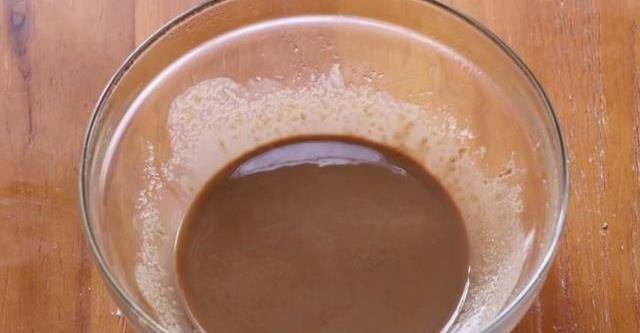 1.碗中倒入30克食用油、20克白糖,再將50克巧克力掰成小塊放入碗中,將小碗放入裝有開水的盆中,用勺子不停攪拌至碗中的巧克力和白糖化開並融合。