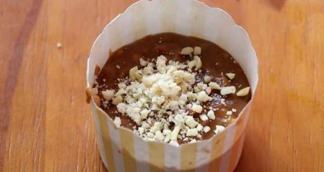 5.將花生碎倒入碗中攪拌均勻,然後倒入紙杯中,裝至7-8分滿即可,上面再撒適量花生碎。