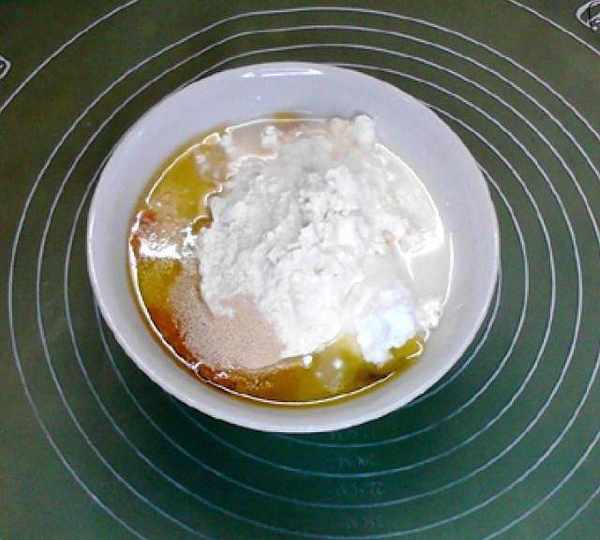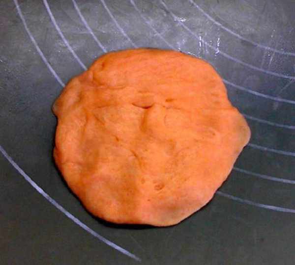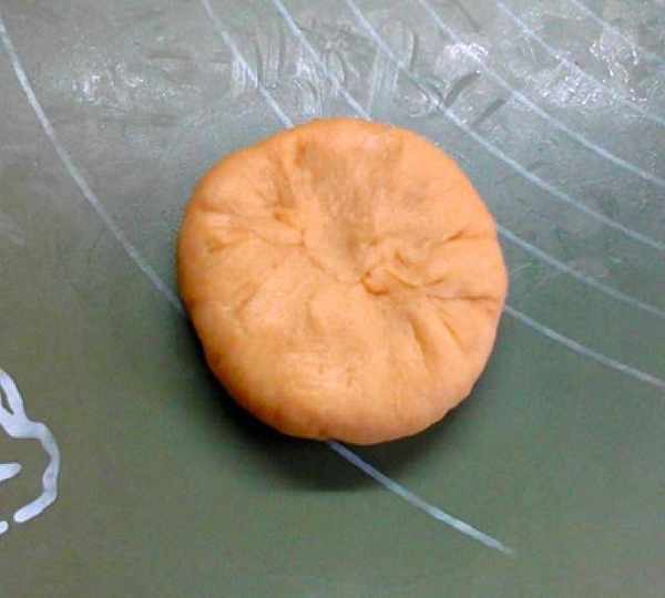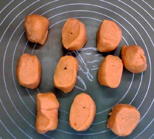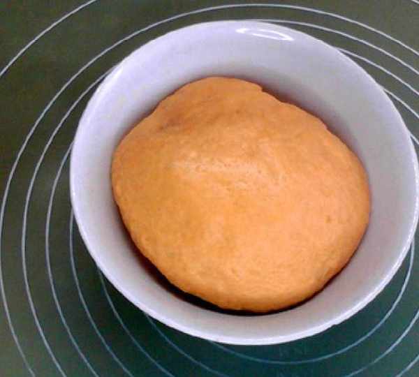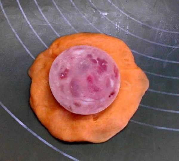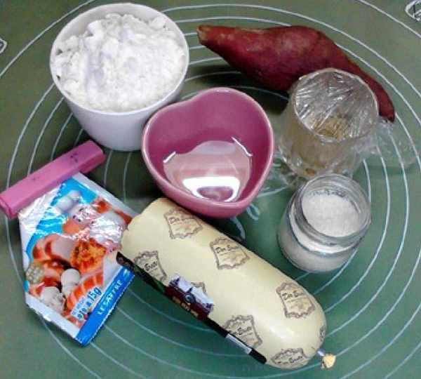 第1步、面團:紅薯泥100克,中筋面粉150克,水30克,橄欖油25克,細砂糖15克,酵母粉2克。餡料:德式啤酒伴侶火腿80克。
