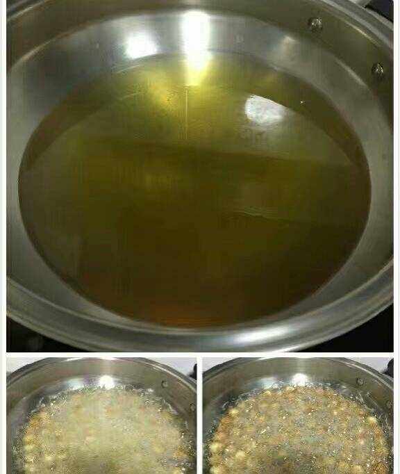 6:中式炒鍋加油燒熱,倒入小面團,剛下鍋需要高溫,為的是炸開花,待開花後火要調至最小火避免炸焦,生坯沒有浮起時不要翻動,容易掉芝麻,直到炸至金黃色撈出瀝幹油分。