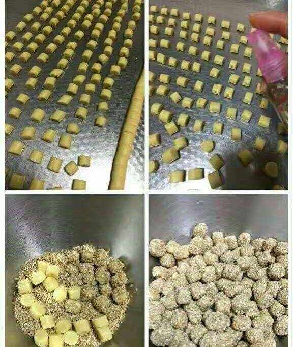 3:面團搓成長條切成大約5克的小劑子(5克-15克都行)4:小劑子上噴灑一些水(為瞭容易沾上芝麻)5:之後將小劑子分多次倒入裝有芝麻的盆中用手將每個小劑子搓一下(不圓也不要緊)