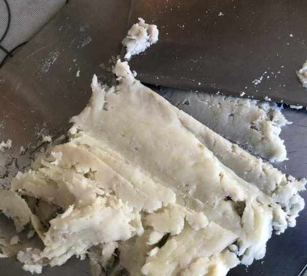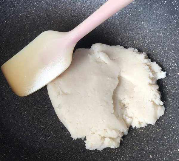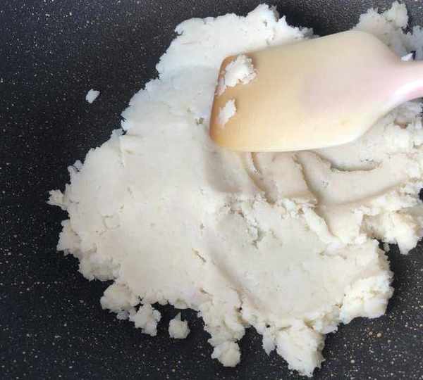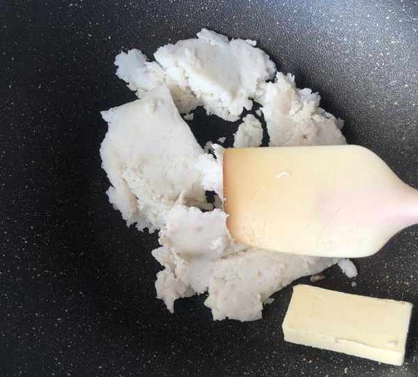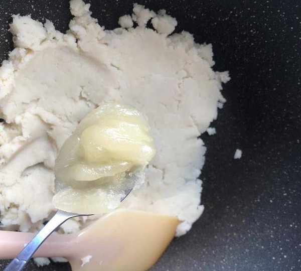 第4步、翻炒到不沾鏟子關火。炒好的山藥泥偏幹些,因為後面還要放蜂蜜。