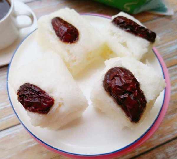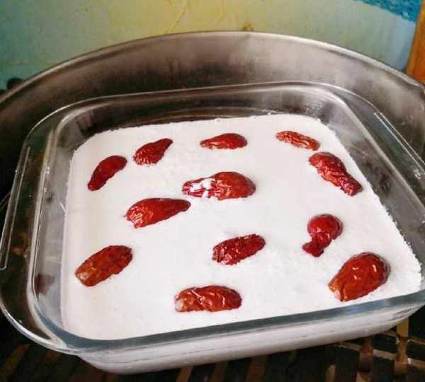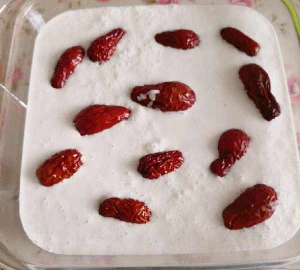 第8步、把發酵好的大米漿倒入容器裡,表面放上大棗。