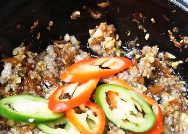 咸魚炒出香味後把肉沫放入,翻炒一分鐘後把薑末,蔥白放入,炒出香味,然後把辣椒放入