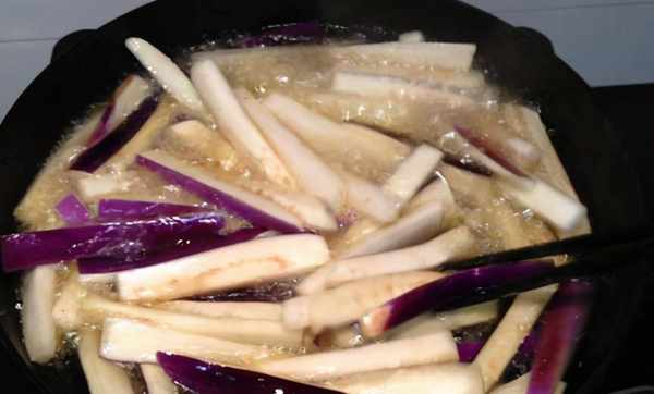 第二步:熱鍋,加入寬油,油溫6成熱後把茄子放入炸一下,註意茄子水分一定要控幹,否則會炸鍋,把茄子炸軟就可以瞭