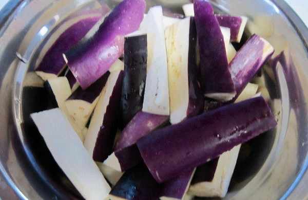 1.茄子切好後,要放到清水裡浸泡一下,這樣能防止茄子氧化變黑,顏值不好看。