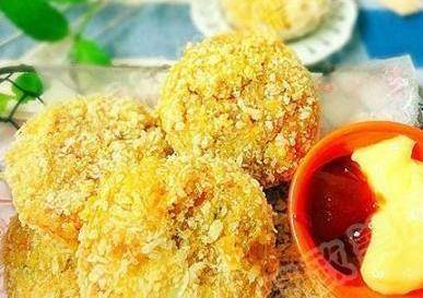 7,將準備好的土豆泥蛋糕表面浸入幹淀粉中,然後塗上一層蛋液,然後塗上一層面包屑