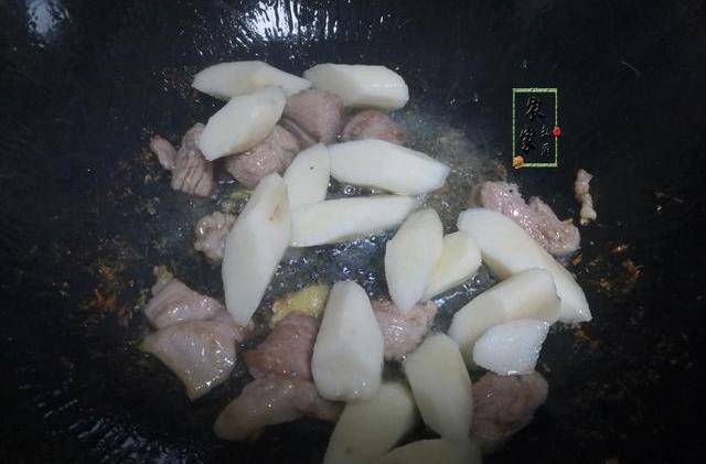 5、炒勻之後,就可以將準備好的山藥下鍋瞭,我們將浸泡的碗裡的山藥瀝幹多餘的水分之後放到鍋裡和豬肉一起翻炒均勻。