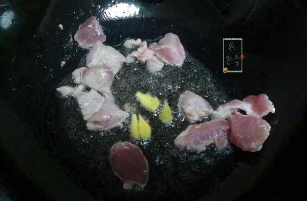 4、直到把鍋裡的豬肉翻炒的明顯變色,肉質開始變得緊實之後,就把切好的生薑下鍋和豬肉一起翻炒,生薑的香味可以有效去除豬肉中的腥味,我們將生薑和豬肉在鍋裡翻炒片刻翻炒均勻。