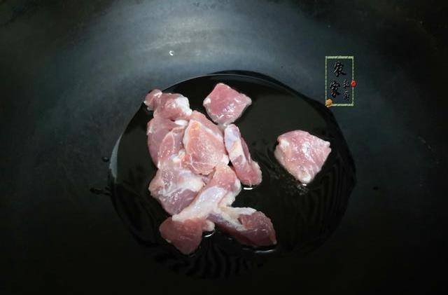 3、將上述的食材都準備好後就可以開始起鍋熱油瞭,取出傢中常用的炒鍋後將鍋面擦洗幹凈。接著往鍋裡倒入適量的食用油,開火將鍋裡的油溫持續加熱到大約五成左右的時候,就把準備好的豬肉下鍋煸炒。