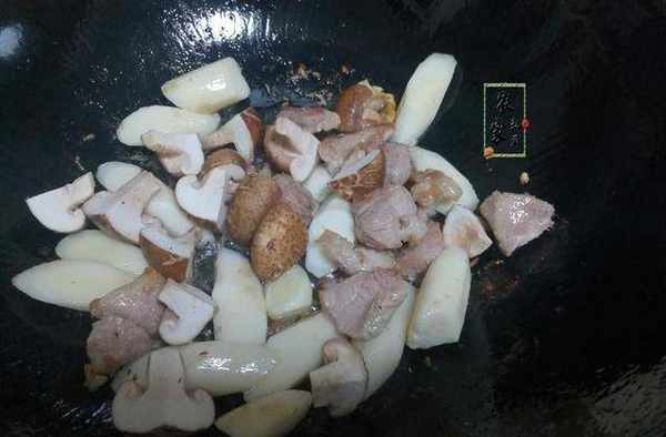 6、然後把切好的香菇也下鍋一塊翻炒,香菇的香味濃鬱用來制作這次的額山藥煲可以有效提升食材中的香味。