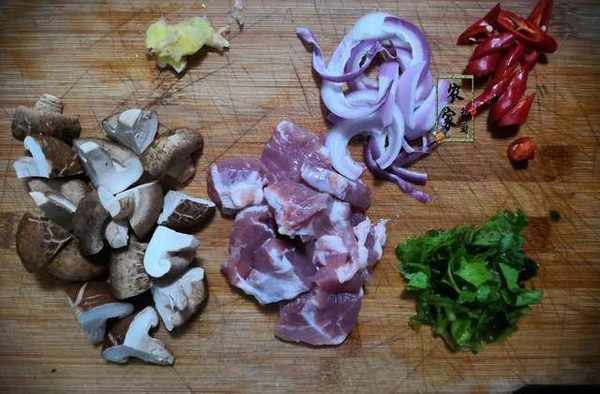 豬肉、山藥、香菇、洋蔥、辣椒、生薑、香菜、食鹽、味精、生抽、食用油