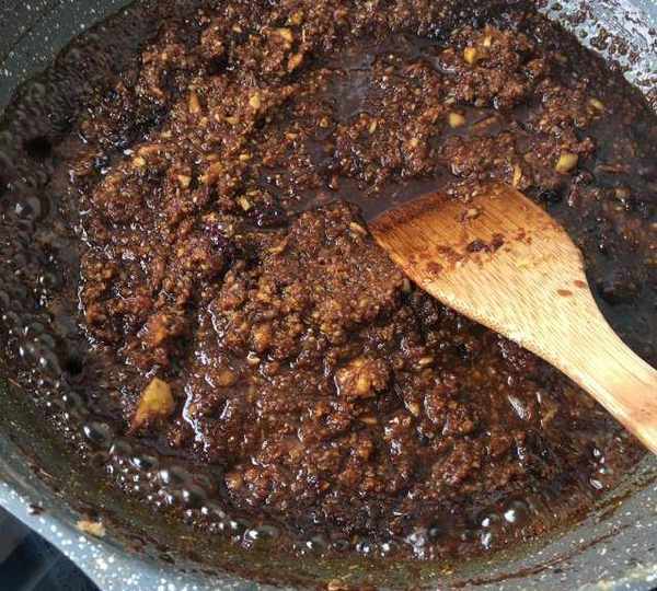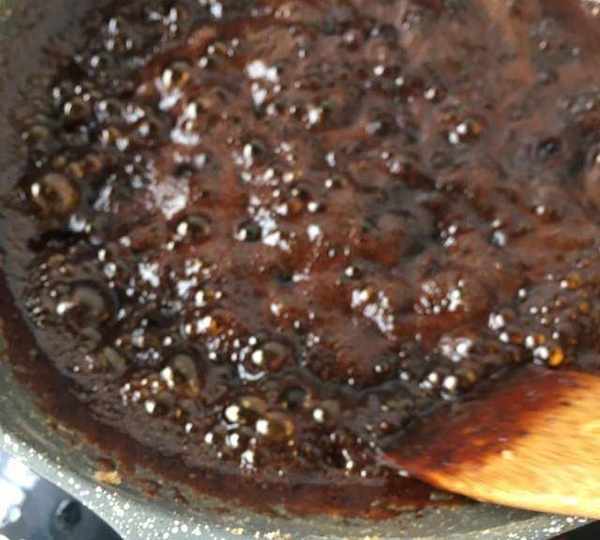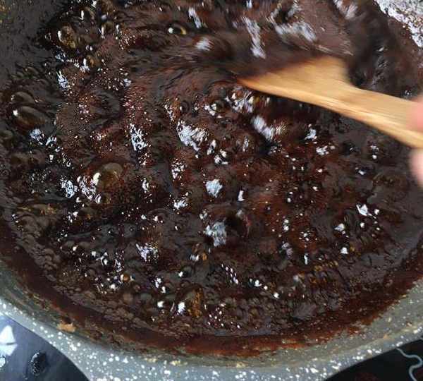 第6步、我還炒瞭薑糖,炒薑糖的鍋直接放入黑糖塊,放小許清水。