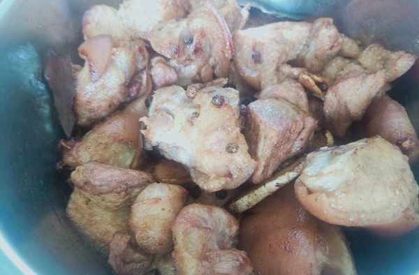 第二步:鍋裡熱油,放1個八角、幾片香味、花椒、生薑,倒入豬腳炒香,加適量的鹽、生抽、老抽少許水炒均勻。