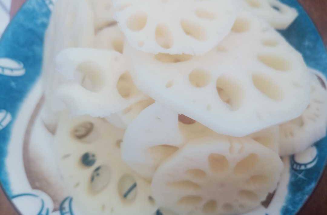 第三步:蓮藕去皮洗幹凈,切成厚厚的大片,再放水裡泡一會瀝幹水分。
