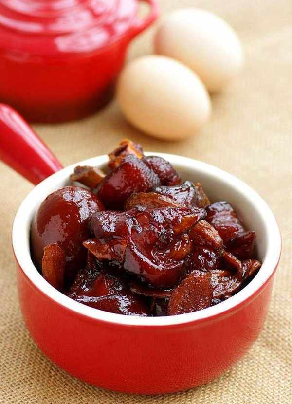 3.接下來我們繼續用剛才炒生薑的鍋來翻炒我們的豬腳,我們把豬腳翻炒至表面微微變黃之後,我們便可以把豬腳放入我們剛才的生薑上面,接下來再往鍋中倒入適量的甜醋,加入適量的冰糖,然後我們用大火煮開,煮開之後繼續用中火燉15分鐘左右,然後把煮熟的雞蛋放入鍋中,這個時候我們就可以把鍋蓋蓋上瞭。