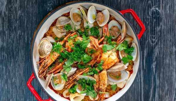 之所以會用到鑄鐵鍋,是因為鑄鐵鍋蓄熱能力強,能夠充分加熱食物,還能保持食材的鮮嫩程度,保留瞭食材的原汁原味。各種海鮮在烤箱中烤制也不會流失水分,反而滲透進米飯之中。