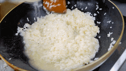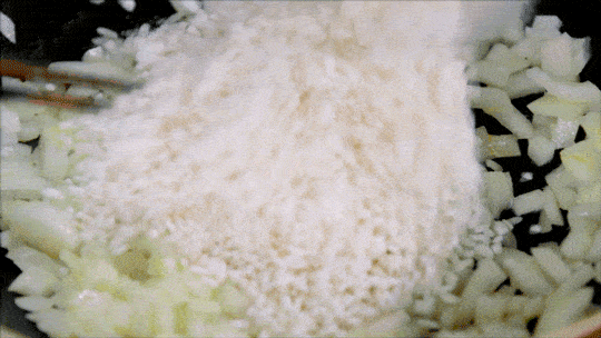 洋蔥放入鍋中,倒入橄欖油翻炒,再加入意大利米一起炒。