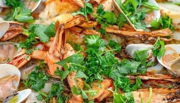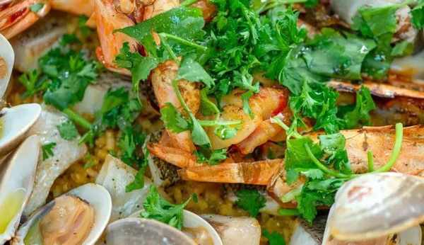 將烤好的海鮮燉飯取出,撒上鹽、香菜、巴西裡、橄欖油、黑胡椒,這道豪華海鮮燉飯就完成瞭。