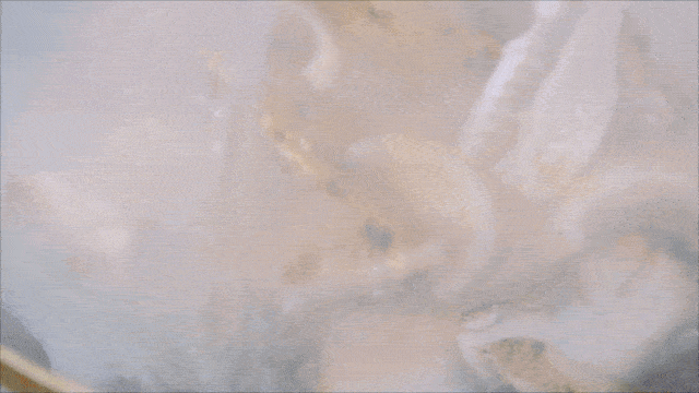 為瞭追求軟糯的口感,在炒米的過程中分次加入高湯攪拌,倒入鑄鐵鍋中再將海鮮鋪上,放進烤箱中烤制。