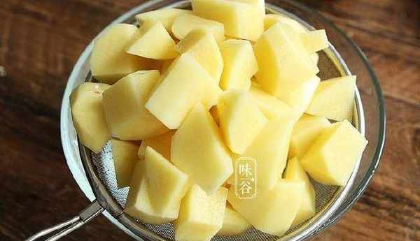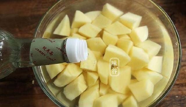 【做法】:1、土豆去皮後切成滾刀塊,用清水沖洗一遍,然後倒入少許醋浸泡十分鐘;