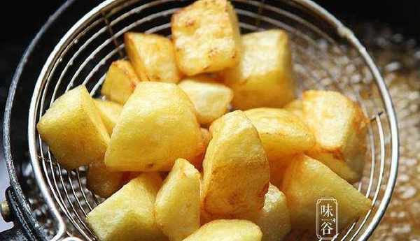 4、中小火炸瞭五分鐘後轉大火,土豆變熟會很軟,這時候不要大力的攪拌以免把土豆弄爛,轉大火,用筷子輕輕攪拌,炸到土豆變硬變金黃後撈起瀝油;