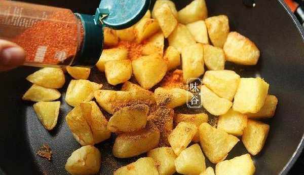 5、把土豆放入炒鍋內,灑入孜然粉、椒鹽粉和辣椒粉;