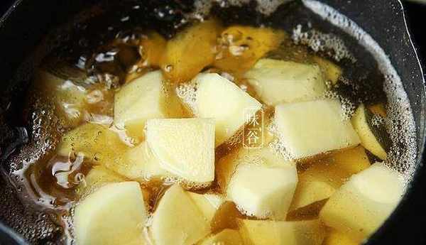 3、鍋內放入適量油,油燒熱後放入土豆塊,轉中小火炸5分鐘;