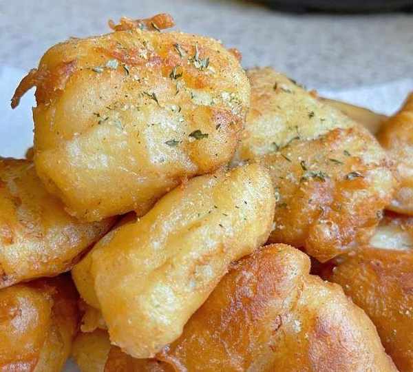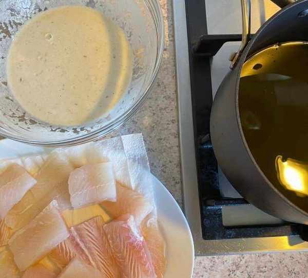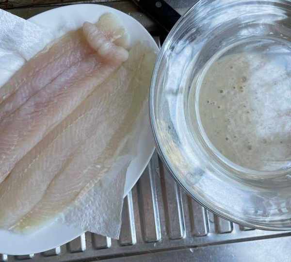 第7步、面糊靜置半小時後,魚肉切小塊,裹上面糊,中火炸5-6分鐘,直到兩面金黃。
