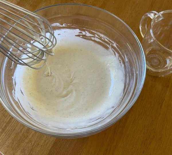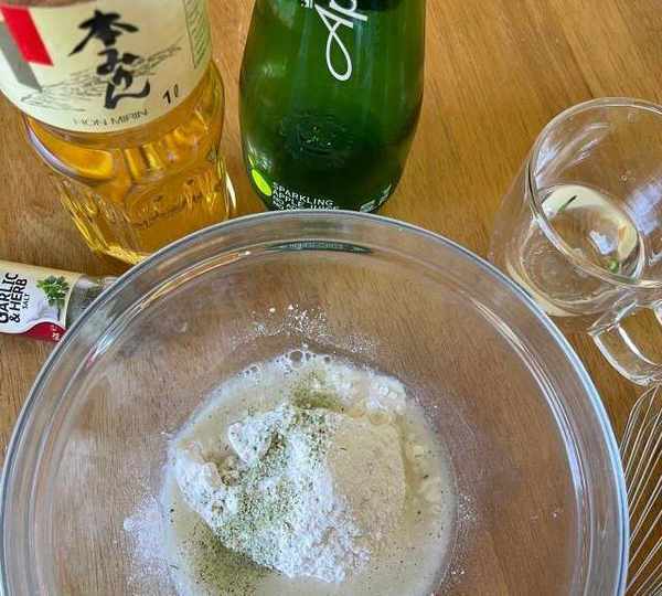 第1步、用面粉,啤酒和小半杯水調成糊,加蒜鹽調味(沒有用黑椒鹽也可以)。我沒啤酒,用瞭氣泡水+味淋代替,這樣氣泡有瞭,酒香也有瞭。清水要一點一點加,別一下子倒進去。