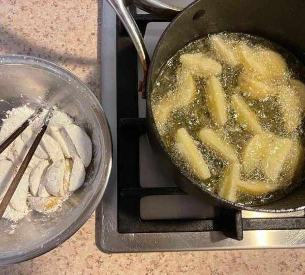 第4步、等待面糊的半小時裡,先動手炸薯角。土豆洗幹凈切塊,切成像橘子那樣一瓣一瓣的形狀。倒入面粉。左晃右晃,上下抖動,均勻沾粉。