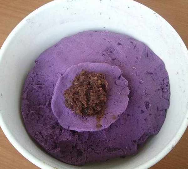 第4步、取適量紫薯面團,按扁,添加豆沙餡。