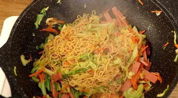 5、最後放入方便面翻炒,炒勻盛出,撒上蔥花就可以瞭。
