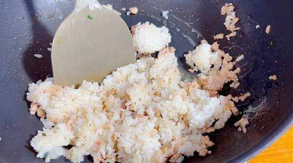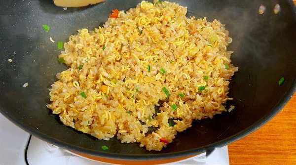 3、倒入隔夜飯翻炒,炒勻後再放入方便面碎,繼續翻炒。