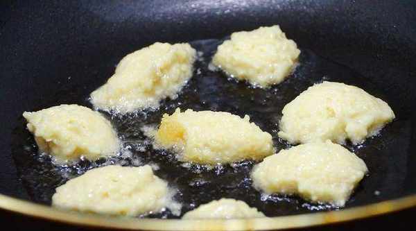 3、另起鍋,鍋中多加一點油,用勺子舀一點方便面蓉放入鍋中,煎至一面定型,再翻面繼續煎,見到兩面都金黃酥脆,就可以撈出瞭。
