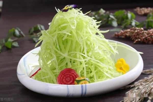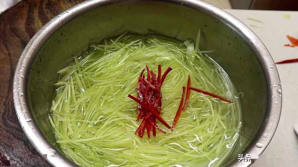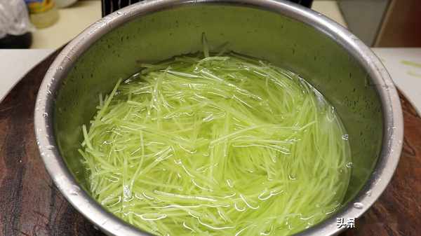 1.準備新鮮的萵筍一根,先削去外皮,切成均勻的細絲,放入盆中,加入適量的清水浸泡3分鐘。