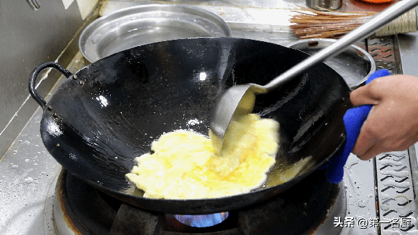 3.炒鍋燒熱,添入半勺食用油,用勺子攪拌幾下,油溫至5成熱時,倒入雞蛋液。等雞蛋液凝固後,晃動炒鍋,再翻面煎制,把雞蛋煎熟以後,倒出控油。