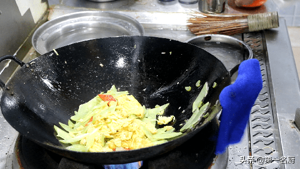 5.加入 食鹽2克,雞粉1克提鮮,繼續上鍋翻炒,15秒後倒入煎好的雞蛋,簡單翻炒幾下,加入少許芝麻油增香,快速翻勻,美味即成。