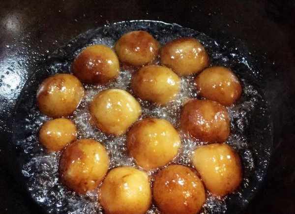 等面團醒瞭一會兒以後,我們就可以把面團拿出來,放在案板上,如果害怕粘手的話,可以撒上一些幹的糯米粉,然後我們就上一小塊兒吧,面團搓成小小的圓子,就像在搓湯圓一樣,而這個大小可以自己來把握,如果想做大一點那麼每一次搓到面團就大一些,想要小一點的話,那麼就可以弄的稍微小一些。在面團都搓好以後,我們就可以開始油炸瞭,首先在鍋裡先加入適量的食用油,等油熱以後,我們就可以把做好的小圓子放在鍋中進行油炸瞭,而再進行油炸的時候,需要不停的進行發動,讓原子能夠更加的受熱均勻,而且不會粘連在一起。而這一步也是非常的重要的,需要自己慢慢的來進行把握,不過一般情況下隻要把圓子都做好,再進行油炸也都是會做得很成功的。