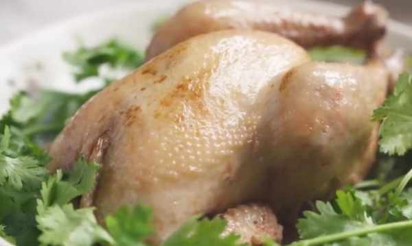 現在時間差不多瞭,到45分鐘的樣子。可以去檢查一下你的雞,如果你能聞到很明顯的雞肉那個香味兒,它差不多就好瞭。這個時候可以出鍋瞭,把表面的錫紙和鹽都去掉,然後註意哦!雞的表皮會比較咸,然後會粘比較多的鹽粒,最好是拿一個小的毛刷,非常仔細地把表面的鹽全部刷幹。現在雞的表面都處理幹凈瞭,就可以轉移到一個盤子,盤子裡我已經事先放一些香菜。