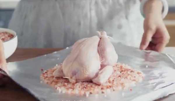 它是巖鹽,和海鹽有些不一樣,你傢裡如果隻有普通的海鹽,也可以用海鹽來鋪,但註意一定不要用細鹽。鋪好鹽結晶之後,把處理好的雞放好,雞胸朝上,然後把錫紙窩一窩,接著把剩下的鹽撒到裡面,盡量均勻的覆蓋到雞的每一寸表皮。然後把錫紙窩起來,接著再準備一張錫紙蓋在表面,把它整個密封。現在烤箱已經預熱的差不多瞭,我們就可以之前預熱的鑄鐵鍋拿出來,然後把包好的雞放入鍋中,再用小刀在表皮拉一個口子,這樣一會兒蒸汽就可以有地方跑出來。
