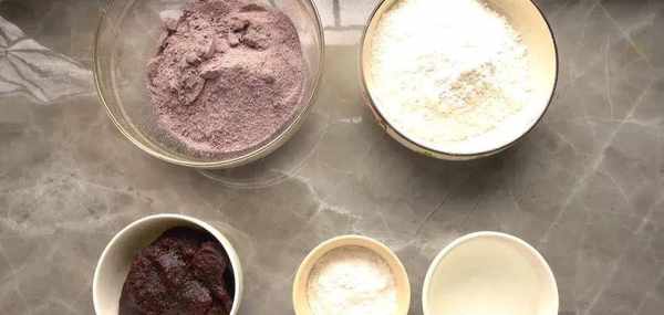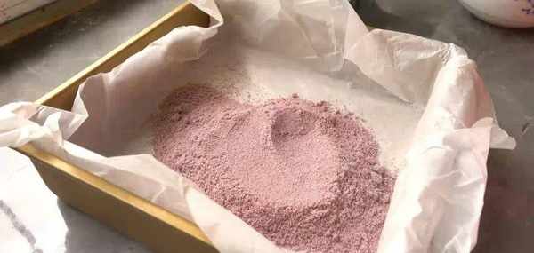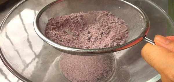 先把紫米粉,糯米粉,白糖粉這三種粉混合在一起,攪拌均勻,全部變紫就好瞭。