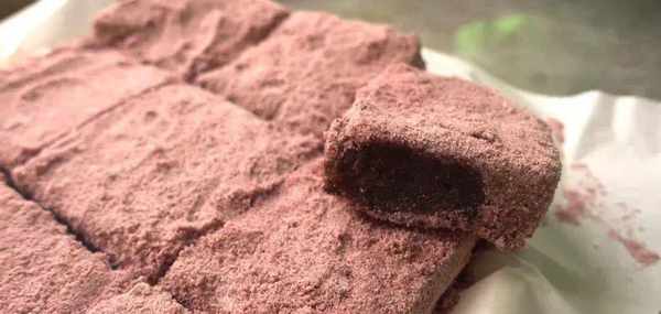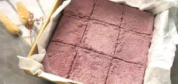 水開以後大火蒸20分鐘。切成9塊,蓬松的紫米松糕就完成瞭。